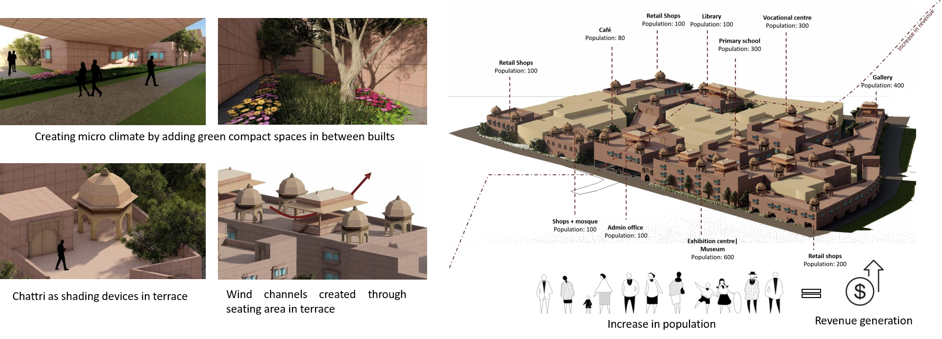 The adaptive reuse of Zeenat Mahal stands as a compelling example of sustainable urban renewal that preserves the cultural heritage of Shahjahanabad while responding to contemporary community needs. Transformed into a mixed-use public space, the project provides a shared platform for learning, leisure, and cultural engagement, allowing local residents to rediscover and appreciate the historical significance embedded within their neighborhood. Drawing inspiration from Mughal architectural language, the intervention reinterprets traditional forms through a modern lens, creating a space that is both rooted in history and relevant to the present. Seamlessly integrated into the surrounding residential fabric, the structure fosters a harmonious relationship between public and private realms, reinforcing a sense of place and belonging. In doing so, Zeenat Mahal evolves from a static heritage site into a dynamic cultural node, actively contributing to the collective memory and identity of the community.