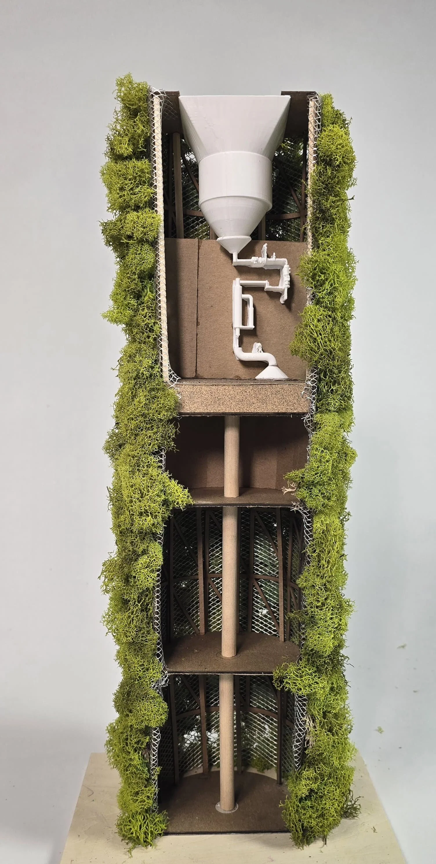 Given that air is the primary element of focus, a comprehensive purification system was developed. This system consists of three key components: an ammonia filtration unit that facilitates the breakdown of ammonia into nitrogen dioxide and sulfur dioxide, followed by specialized purification chambers designed to treat each of these byproducts. The system includes pressure-regulating valves, an energy-supplying pump, and an integrated waste collection mechanism. Notably, the collected waste is redirected back into the filtration system, creating a closed-loop cycle. In the final stage, the air passes through large-scale mesh purifiers before being released back into the natural environment, ensuring maximum purification and minimal environmental impact.